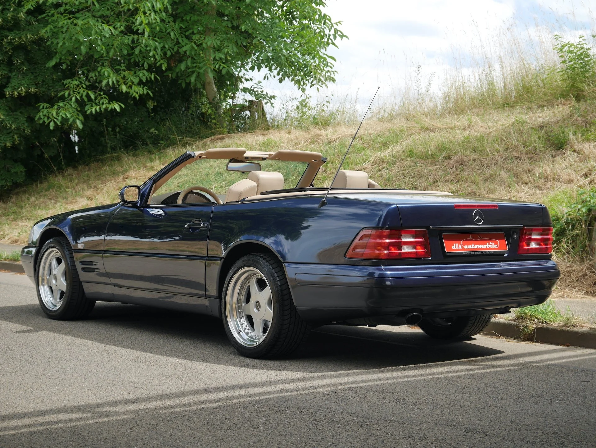 Wir spendieren ihm nun neben seinem schon montierten, neuen Verdeck und der Hydraulik eine umfassende Inspektion mit neuen Reifen, neuer Hauptuntersuchung nebst Abgastest, und freuen uns, wenn sich jemand genauso dafür begeistern kann, wie wir es taten. Die Farbkombination azuritblaumetallic mit dem safranfarbenen Nappaleder ist schlichtweg eine Wucht. Die Wurzelholz-Applikationen auf dem Armaturenbrett harmonieren perfekt mit dem Leder und Teppich.